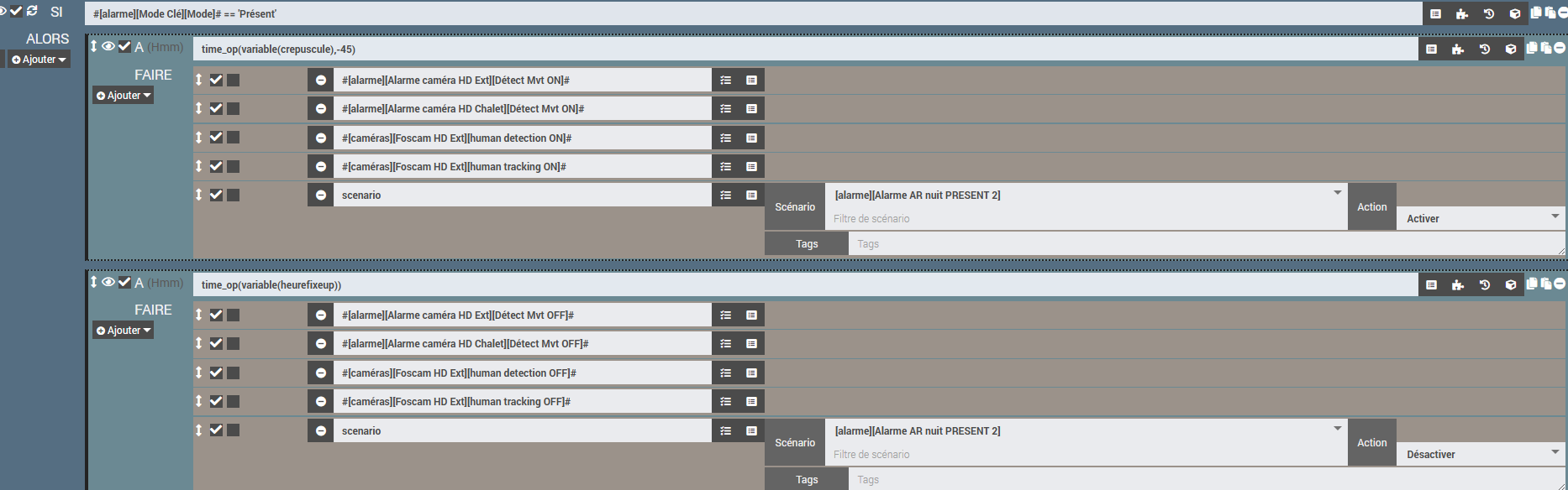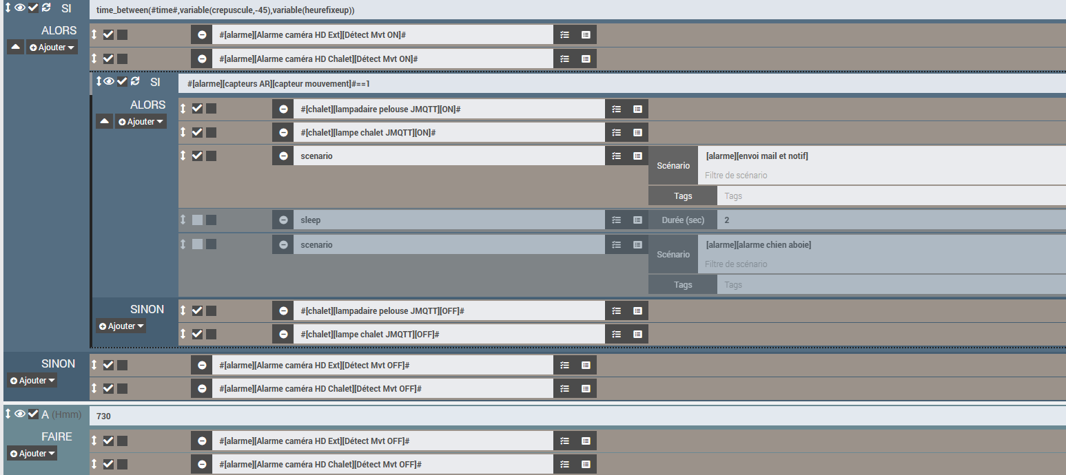 J’ai essayé mais cela n’a pas fonctionné. Avec le SI, quel type de déclencheur: « #[alarme][Alarme caméra HD Ext][Détect Mvt ON]# » par exemple ? ou un déclencheur « programmé » comme actuellement ?