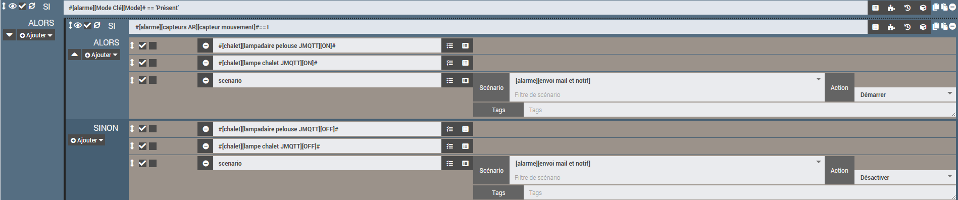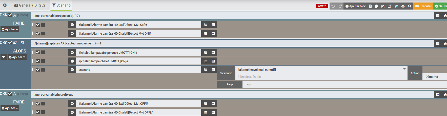 [2025-06-06 13:48:45][SCENARIO] -- Début : Scenario execute automatiquement sur evenement venant de : [alarme][capteurs AR][capteur mouvement] (0).