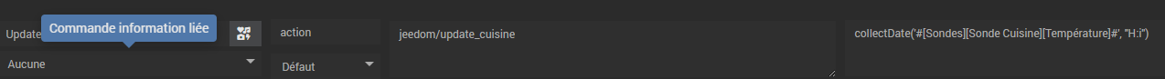 collectDate(cmd,[format]): Renvoie la date de la dernière collecte de données pour la commande placée en paramètre, le 2ème paramètre optionnel permet de spécifier le format de retour (détails ici). -1 : La commande est introuvable, -2 : La commande n’est pas de type info.