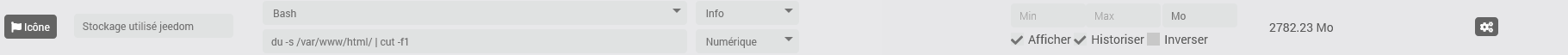 J’en arrive à ma question certainement basique pour les pros de Jeedom. Comment récupérer cette valeur , « espace disque libre » , ou celle de la commande linux "df -k /var " pour l’utiliser dans un scénario ?