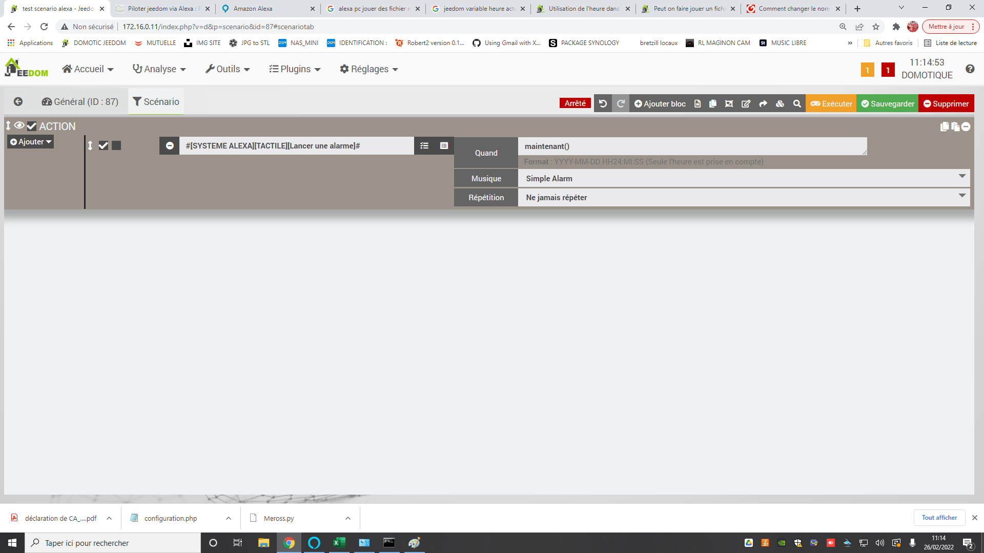 Alexa ne proposant pas de pouvoir jouer directement des MP3 sur l’app PC, je me suis dit je vais utiliser les son dispo des alarmes pour déclencher des alertes (sonnette etc…) mais pour ce faire je dois (je penses) passer par un scenario pour déclencher une alarme et il faut pour cela déterminer un temps de déclenchement :