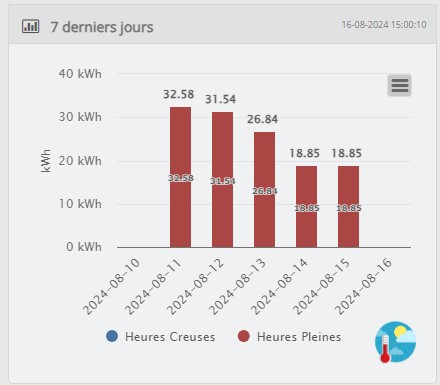 Le plugin fonctionne par différence sur une journée. Il regarde donc sur le 16/08, la plus petite et la plus grande des valeurs, fait la différence et enregistre ça pour la consommation du jour.