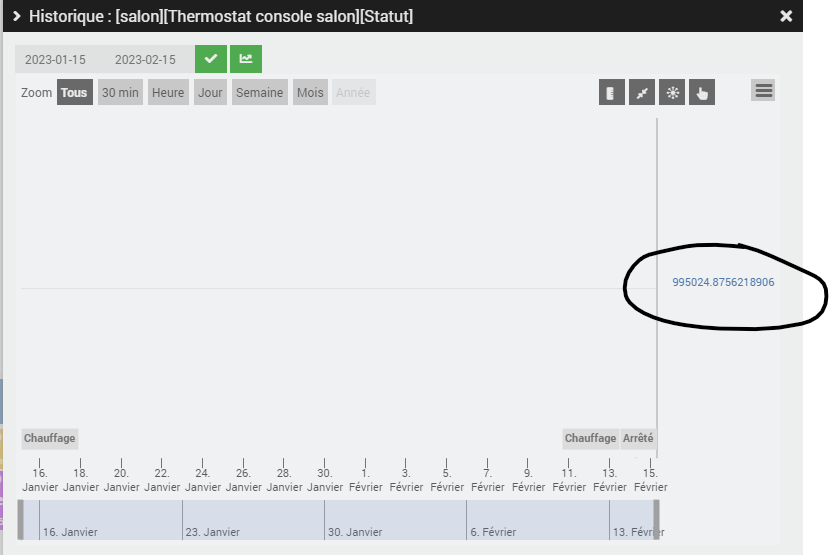 dans tous mes thermostats, j’ai cette même valeur incohérente dans l’historique de la commande statut du plugin thermostat: « 995024.87… »