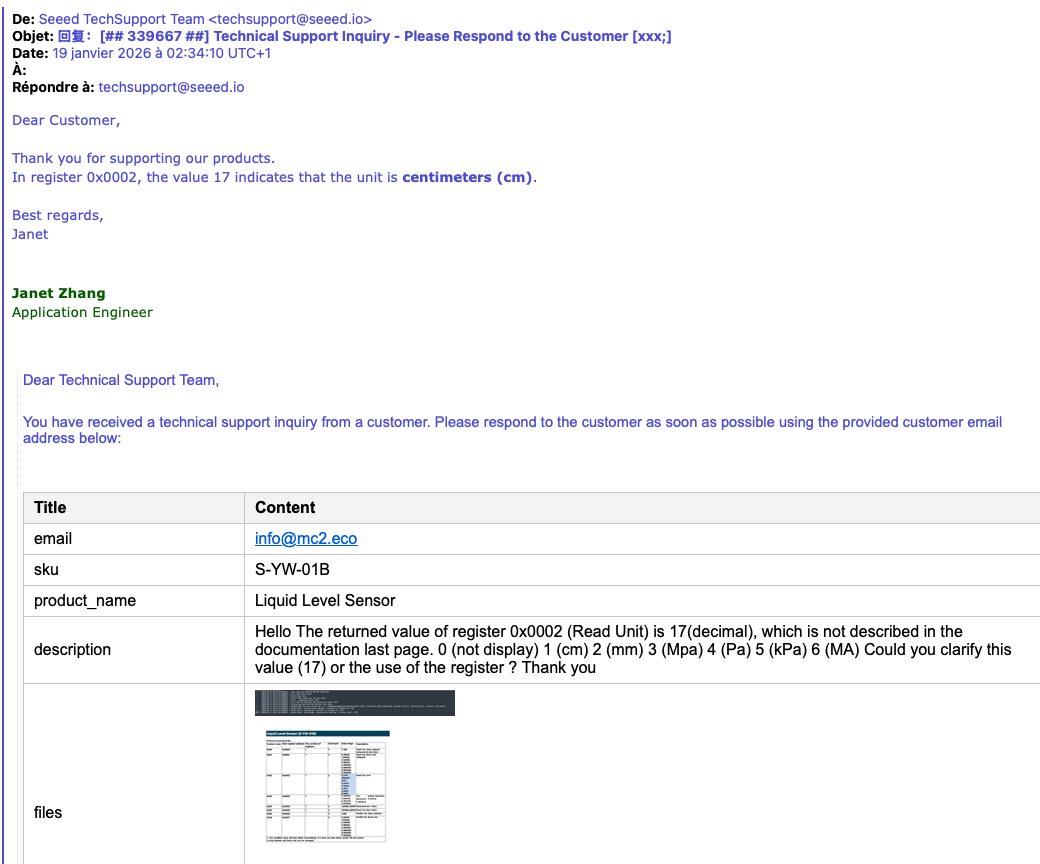 Je souhaiterais un avis concernant une valeur retournée par un sonde Piezo (Seeed studio S-YW-01B) en particulier la valeur « Read unit ». La valeur qui est retournée sur base de la config ci joint est 17 decimal or cette valeur n’est pas reprise dans la doc de la sonde. Doc ou la config incorrecte ?