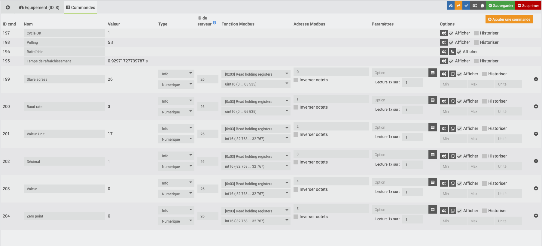 Les requêtes que vous faites vous permettent de passer par une plage de registre. Je vous suggère de déclarer une lecture de plage de registres avec 0 [6], de sauvegarder pour que la commande existe et de modifier vos commandes de lecture de sorte d’utiliser cette plage. Le temps de rafraichissement s’en verra réduit et la charge système également.