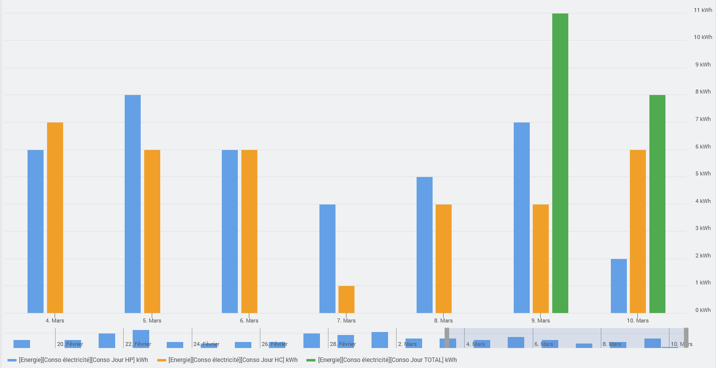 Si on regarde la conso d’aujourd’hui, je suis bon par rapport au panel du plugin (2 kWh HC et 6 kWh HP) mais les jours précédent ne correspondent pas. Hier par exemple, j’ai consommé 7 kWh HC et 7 kWh HP. Sur le panel je suis bon (j’ai 8 kWh en HC au lieu de 7 mais c’est souvent que j’ai 1 kWh réparti sur le mauvais jour) mais sur le graphe des commandes j’ai 7 kWh HP et 4 kWh HC et je n’arrive pas à comprendre d’où viennent ces écarts. Vu que j’affiche le maximum par jour de chaque commande, je m’attendais à retrouver donc ma consommation des différents jours quand j’en fais un graphe. Est-ce que ma méthode est mauvaise ?