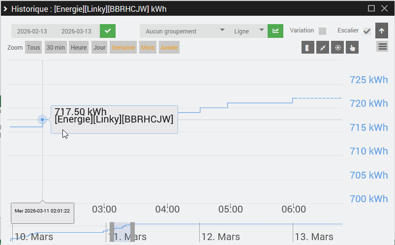 Le lendemain entre le 10 et 11, la conso HC entre 22h et minuit a été prise en compte et la valeur de la commande Conso Jour HC est passée de 6 à 1 (variation de -5) même s’il y a eu un foirage certainement dû à un arrondi. J’aurai dû avoir une variation de -1,5 mais j’ai l’impression que la commande ne gère que les nombres entiers. On voit également, je pense, un problème d’arrondi entre minuit et 6h le 11 mars où j’ai 2 augmentations de 1,5 kWh de mon index HC linky mais la valeur de la commande à 3h n’augmente que de 2 au lieu de 3.