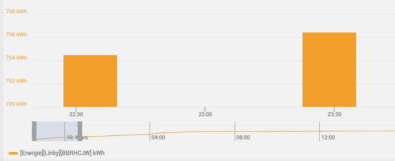 Ma plage heures creuses commence à 22h et se termine à 6h. Et lors de l’actualisation de la commande Conso Jour HC à minuit, régulièrement il ne prend pas en compte la conso HC entre 22h et minuit. Si on regarde sur mon graphe HC entre le 9 et le 10 mars, la valeur de la commande Conso Jour HC qui était de 4 kWh avant minuit varie de -4 à minuit et vaut donc 0 alors que mon index HC linky a augmenté de 2 kWh à 23h28. La valeur de la commande Conso Jour HC aurait donc dû passer de 4 à 2 au lieu de 0.