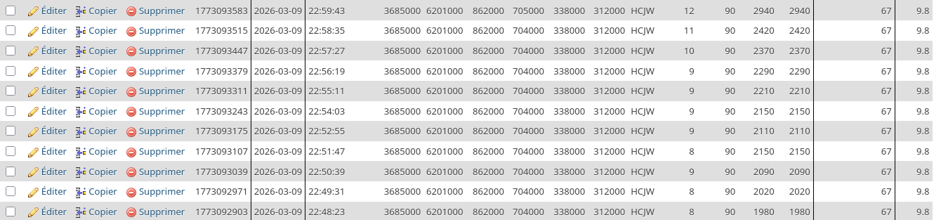 J’ai jeté un oeil à la config de mon TIC et il était réglé sur une précision de 2 décimales, avec un max de 3, je l’ai donc passé à 3. Mais tu as tapé juste, le problème venait de mon TIC. Après coup, je me rends compte qu’il ne fonctionnait pas réellement avec la configuration affichée (2 décimales) vu qu’il envoyait toujours des chiffres avec 0 à la dernière décimales. Dés que j’ai modifié la config, le TIC a envoyé des index avec 3 digits en XXX,430 (avec toujours un 0 à la fin, donc avec une précision réelle de 2 décimales seulement) puis après quelques minutes il s’est mit à envoyer des index avec une vraie précision de 3 chiffres après la virgules (sans un 0 systématique en dernier digit). Et la table conso_teleinfo se retrouve avec des valeurs au Wh près, ce qui va régler mon problème.