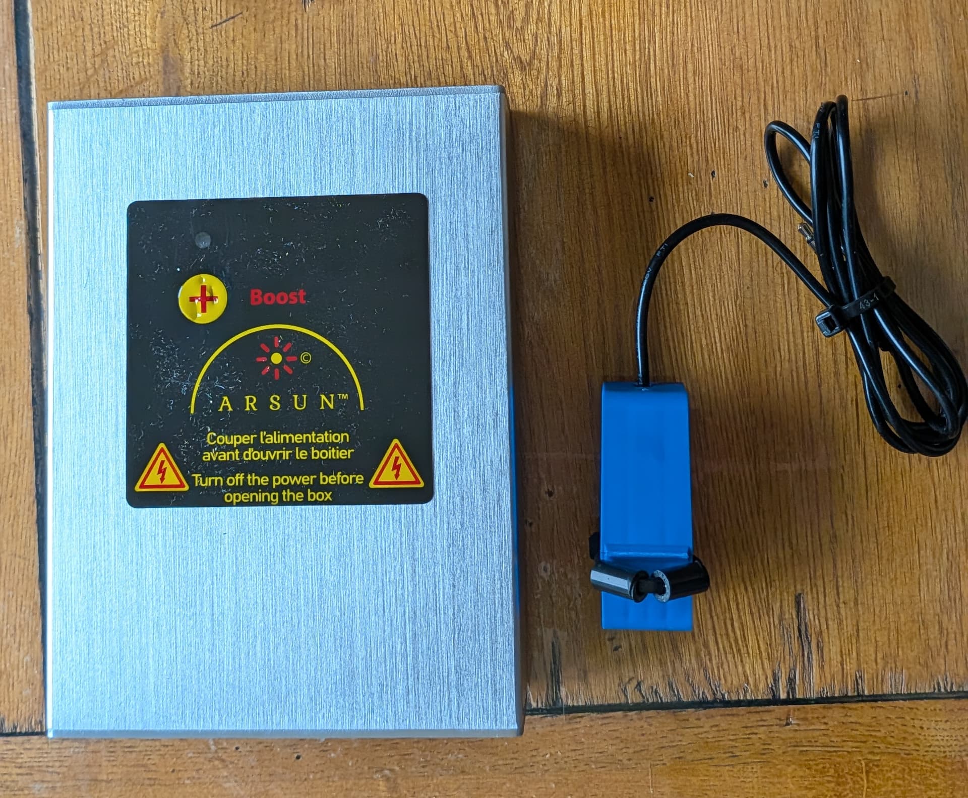 Bonjour, Je vends un Arsun, routeur solaire 1 voie monophasé. Livré complet avec la pince de mesure et les 3 entretoises pour la pose.