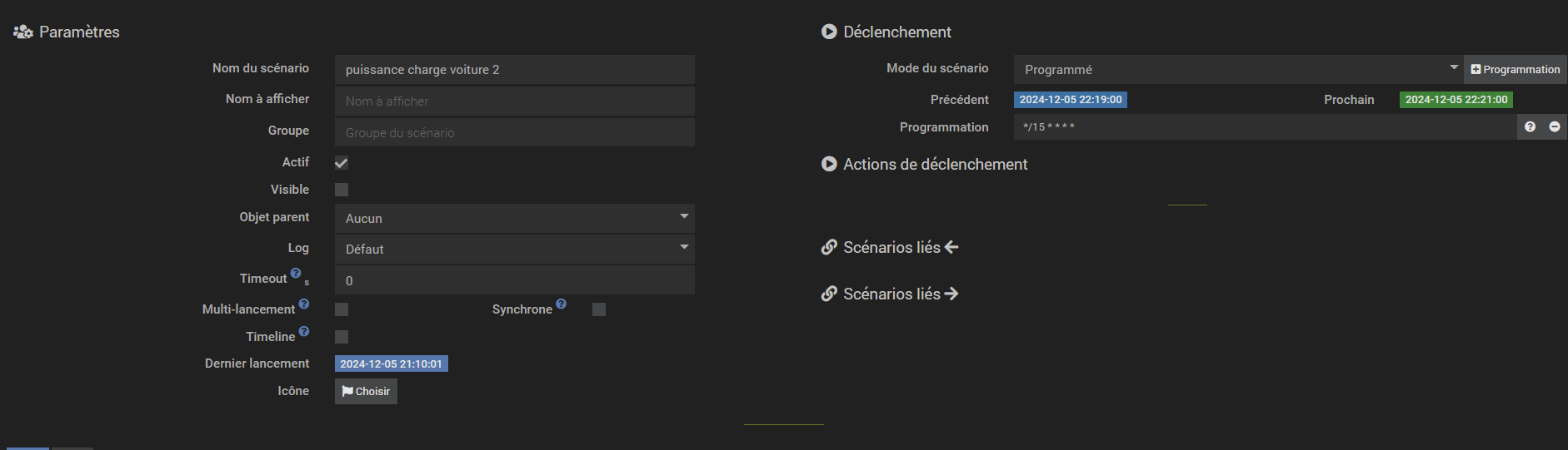 La charge de la VE se déclenche à 2h, je souhaite donc créé un scenario qui contrôle toutes les 15 minutes entre 01h55 et 10h00 (21h55 et 22h55 étaient des valeurs tests pour ce soir dsl) l’intensité demandée par la pompe à chaleur pour éviter une surcharge du compteur par la borne VE et en cas de surcharge déclenché un interrupteur qui divise la puissance de la borne par 2.