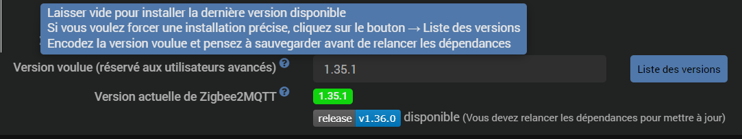 Pour forcer une version, vous devez cliquer sur liste des versions et encoder une version qui existe ou a existé et ensuite sauvegarder . Puis relancer les dépendances.