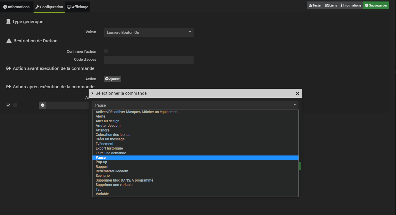 Et ensuite normalement pas besoin de virtuel il faut passer sur la config avancée de ta cde ( les engrenages au bout de ta ligne), donc ensuite Onglet Configuration de cette cde, tu devrais voir Action après exécution de la commande IL Y A LA MEME CHOSE AVANT EXECUTION