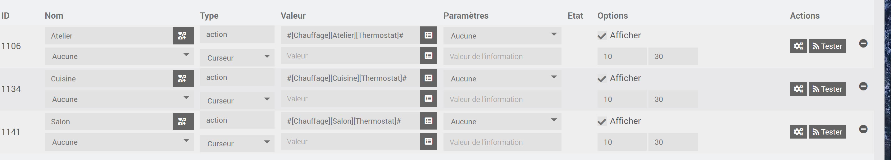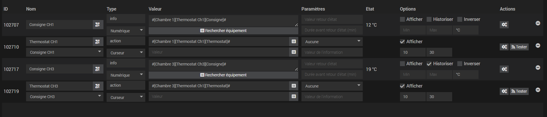 Voila ce que j’essaye de faire et cela fonctionne bien sur le premier, on voit d’ailleurs bien la consigne qui est affichée et lorsque je la modifie cela fait bien évoluer le thermostat. Mais pour les les autres ca ne fonctionne pas.