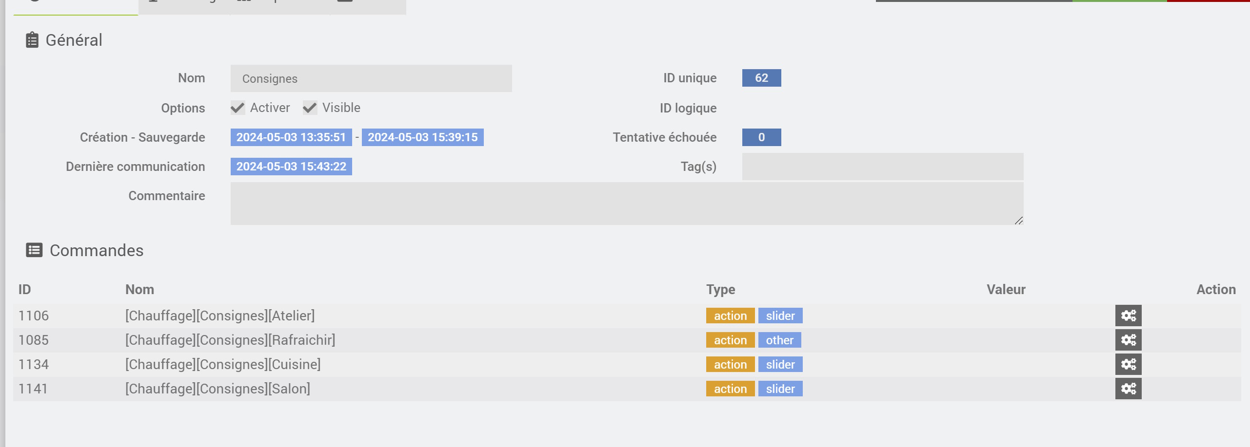 Si je regarde la configuration avancée il y a un objet de plus « Consignes Chauffage Rafraichir » mais je ne sais pas comment il est arrivé la