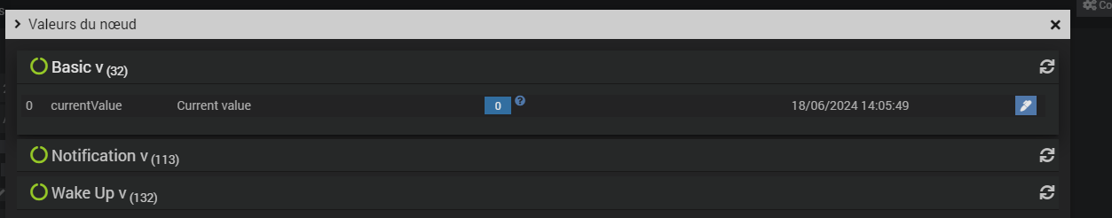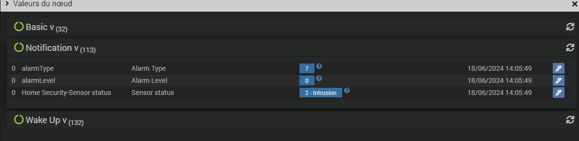 quand j ouvre ou ferme la fenetre, j ai bien la valeur du noeud « alarm level » qui passe de 0 à 255