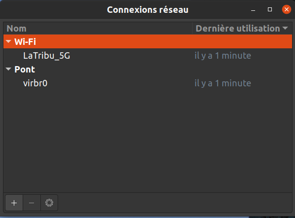 Je vous fais part de mes avancées. J’ai finalement laissé de côté Virtualbox pour me tourner vers QEMU/KVM. Après quelques tâtonnements je suis arrivé à faire fonctionner une VM Jeedom. J’ai tout d’abord créé un pont sur ma carte wifi, sur ma machine hôte donc (ubuntu 20.10 pour rappel). Pour info j’ai utilisé une application que je ne connaissais pas mais bien pratique : nm-connection-editor qui m’a permis de ponter ma carte