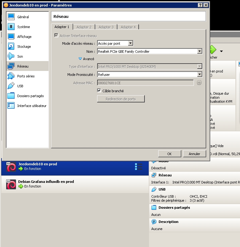 la configuration réseau par pont a été activée dès l’installation