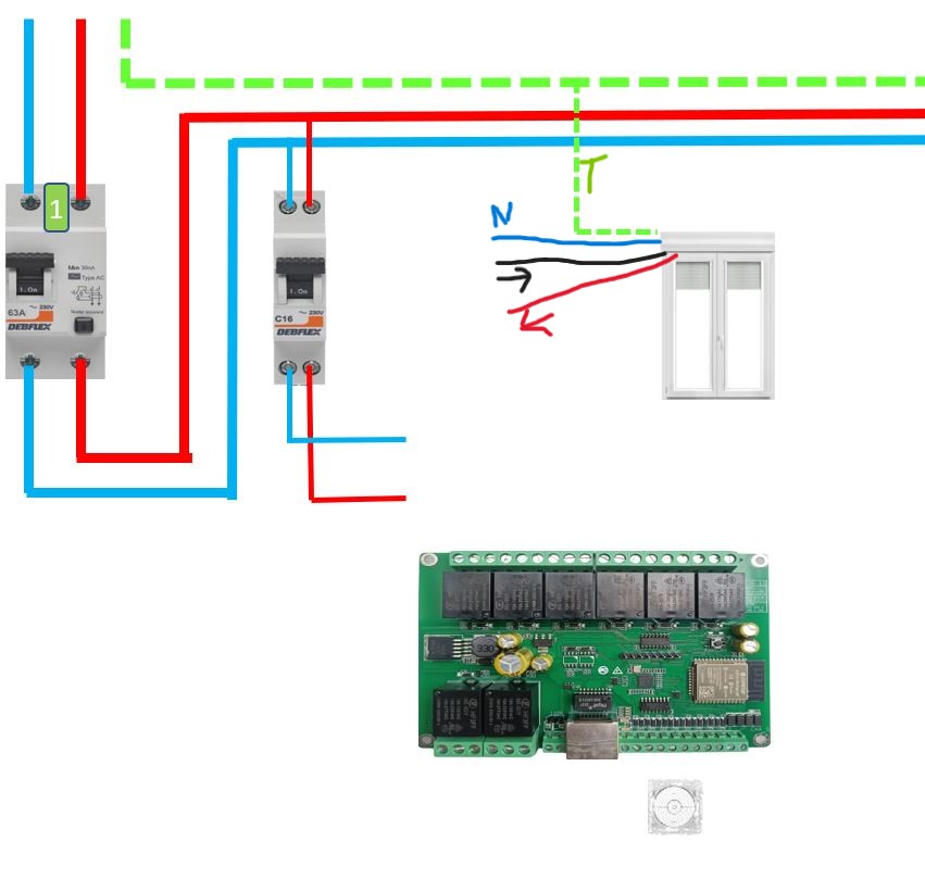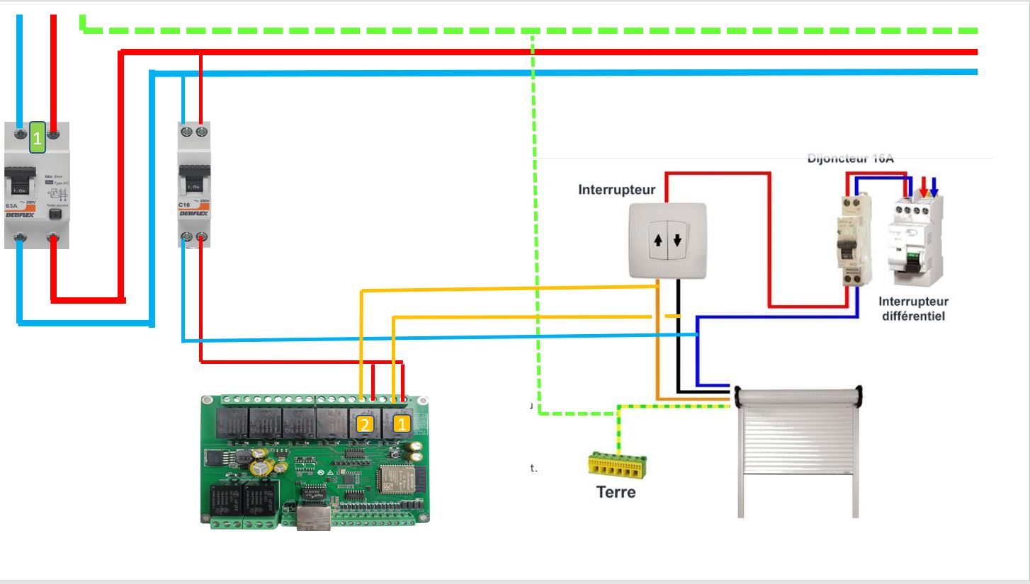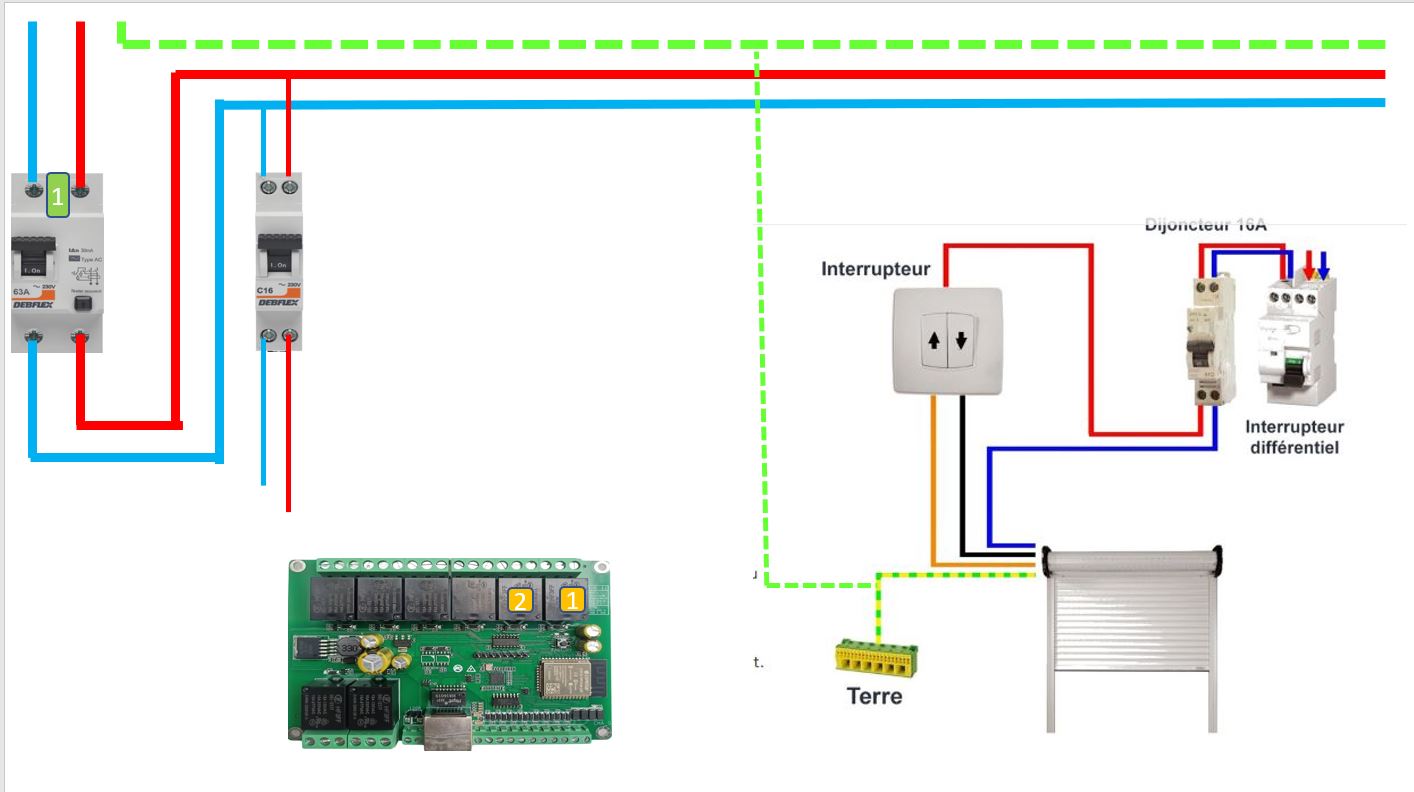 Mais c’est le seul que je n’ai pas compris, donc si une personne peut me raccorder mes relais 1 et 2 et du disjoncteur d’alimentation au système du volet roulant d’un coup de crayon, je pourrais comprendre le schéma en visuel et cela me permettra de comprendre le branchement du relais de bad. et cela me permet d’apprendre.