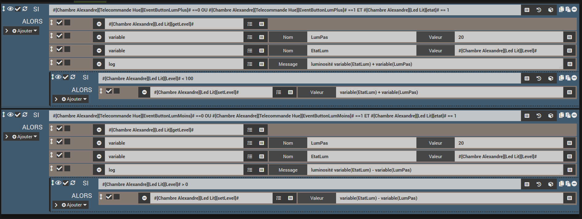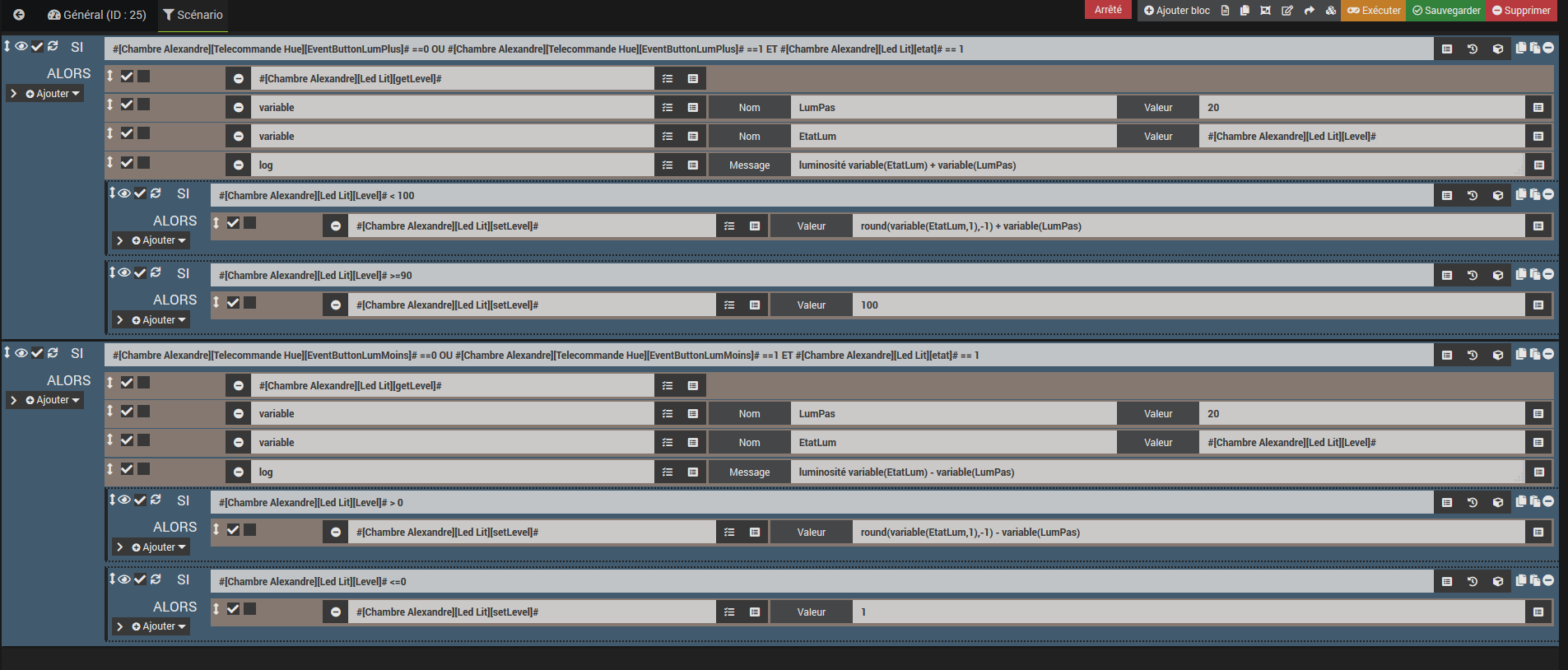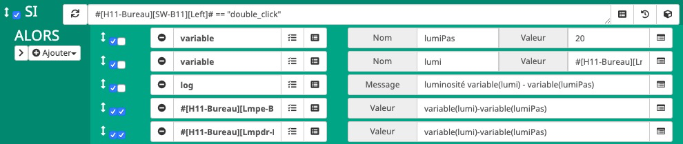 Je montre ci-après un exemple de scénario qui me permet de commander un spot avec un bouton, le lampadaire avec l’autre et les deux ensembles avec « both »