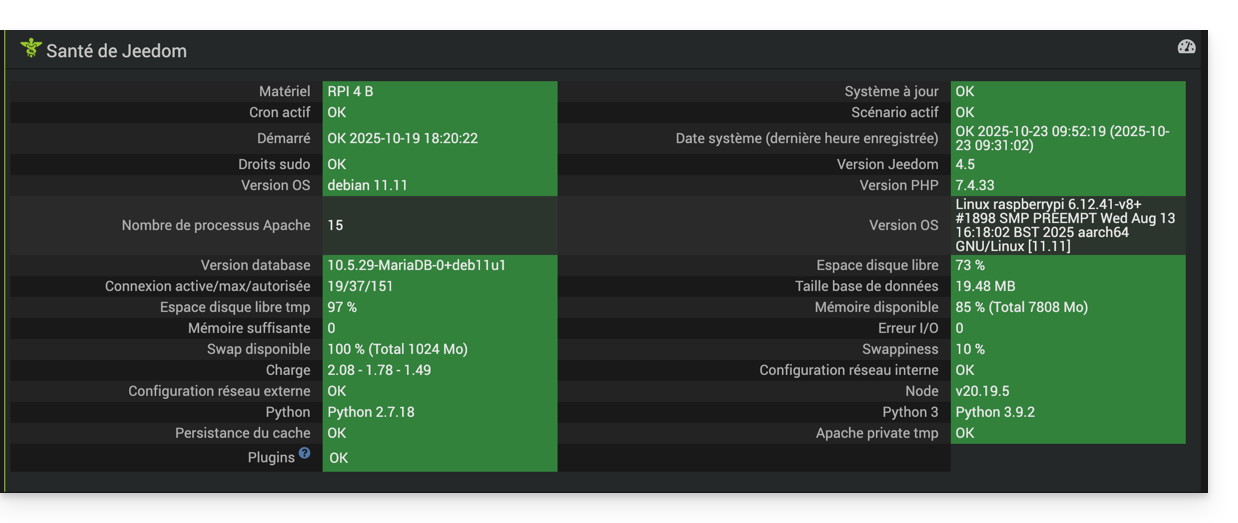 merci pour cette réponse. ok donc j’ai juste à attendre pour avoir la bonne unité. à part ça, mon jeedom me semble pas lent à d’autres occasions, je sais pas si on peut le voir ici?