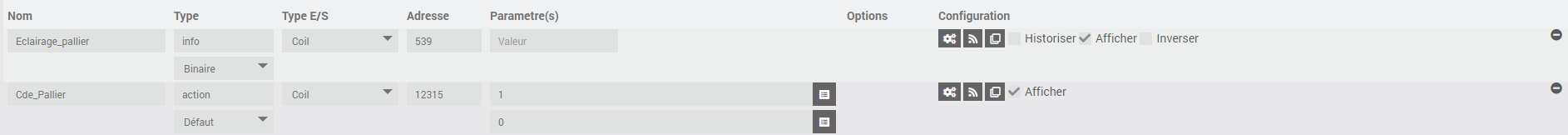 - Commande action Modbus = La commande action/defaut « Cde_Pallier » du plugin MyModbus