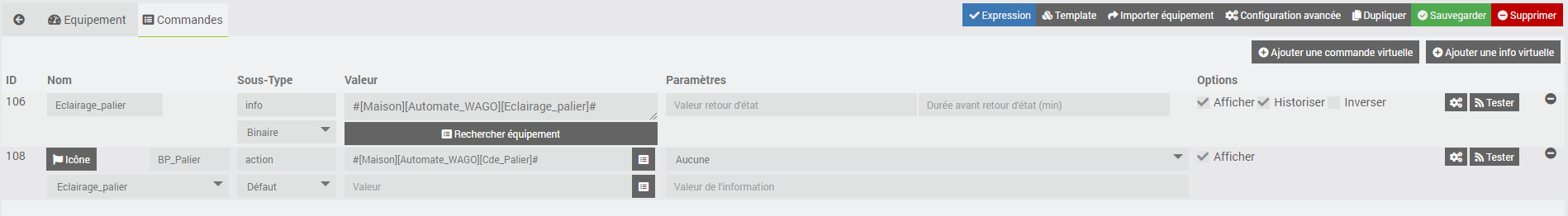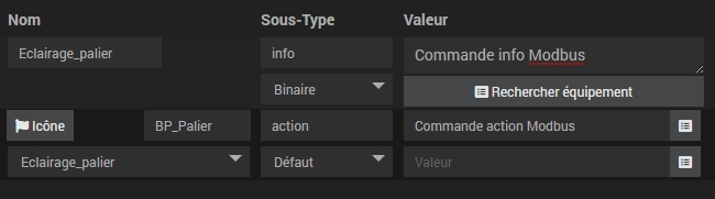 - Commande info Modbus = La commande info/binaire « Eclairage_Pallier » du plugin MyModbus