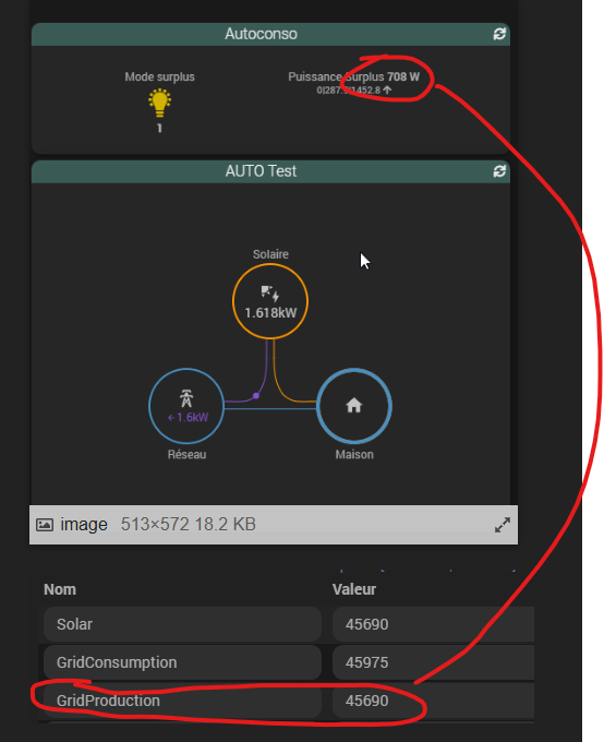Je visualise la production qui part dans le reseau . On constate qu’il y a un surplus de 708w pour une production de 1618w donc logiquement environ 900w consommé par la maison que l’on ne visualise pas.