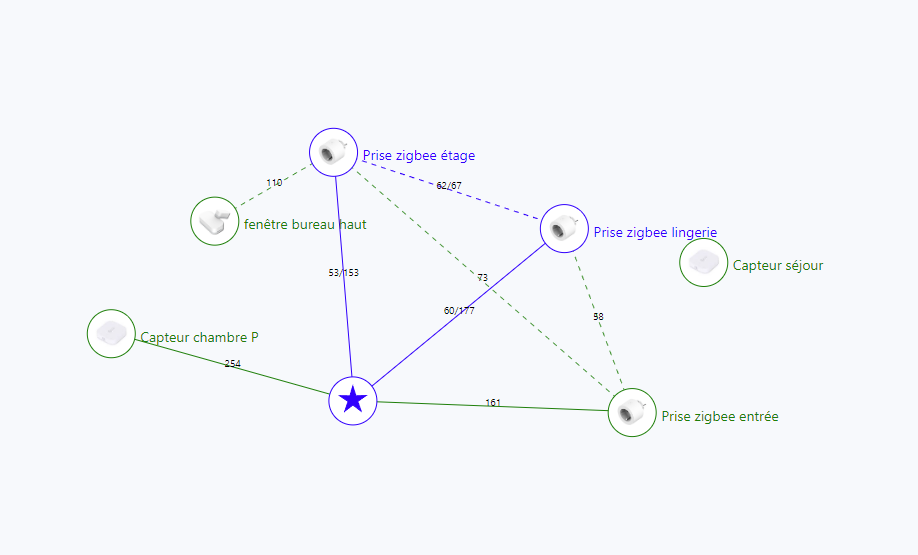 Petit schéma ci-dessous où on peut voir deux choses, la prise en question en ligne verte(prise zigbee entrée) et un autre adaptateur sans liaison mais qui pourtant fonctionne (capteur séjour) :