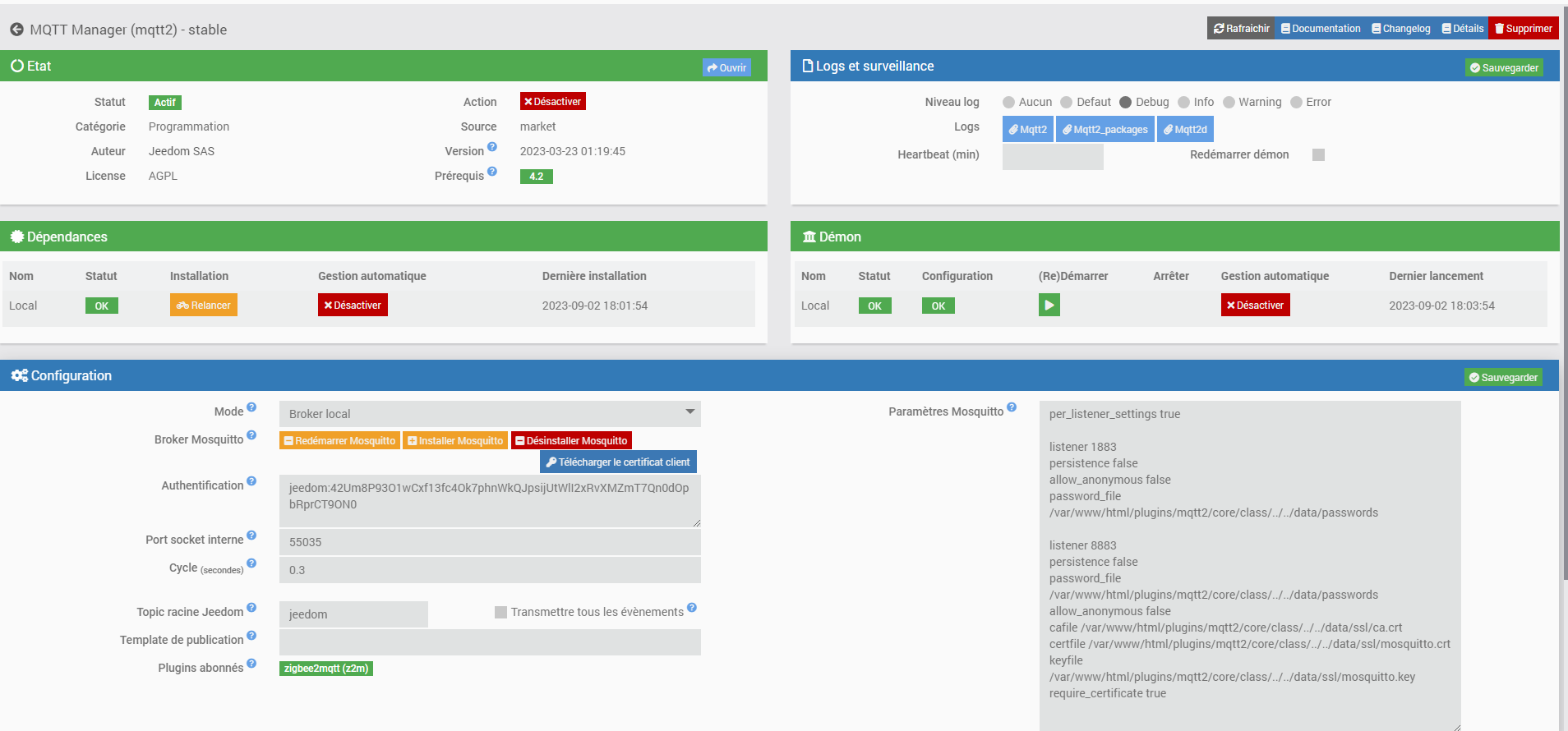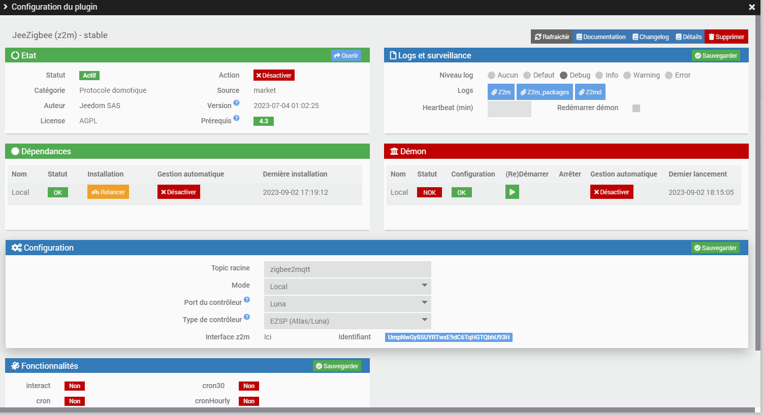 Zigbee2MQTT:debug 2023-09-04 20:00:21: Using zigbee-herdsman with settings: '{"adapter":{"concurrent":null,"delay":null,"disableLED":false},"backupPath":"/var/www/html/plugins/z2m/data/coordinator_backup.json","databaseBackupPath":"/var/www/html/plugins/z2m/data/database.db.backup","databasePath":"/var/www/html/plugins/z2m/data/database.db","network":{"channelList":[11],"extendedPanID":[221,221,221,221,221,221,221,221],"networkKey":"HIDDEN","panID":6754},"serialPort":{"adapter":"ezsp","path":"/dev/ttyUSB1"}}'