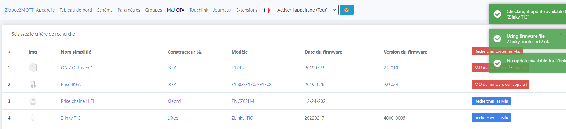 Ben, depuis l’interface web Zigbee2mqtt. Il y a un onglet en haut, ‹ OTA › ; si tu cliques dessus, ça liste tous les équipements qui peuvent être mis à jour en OTA.