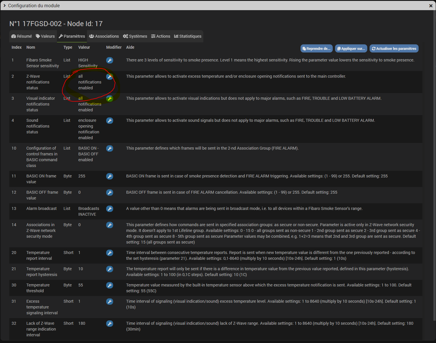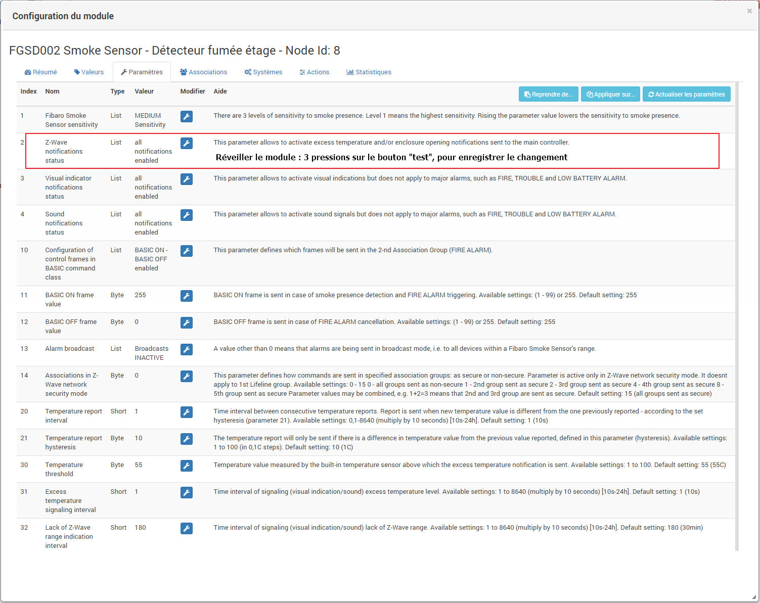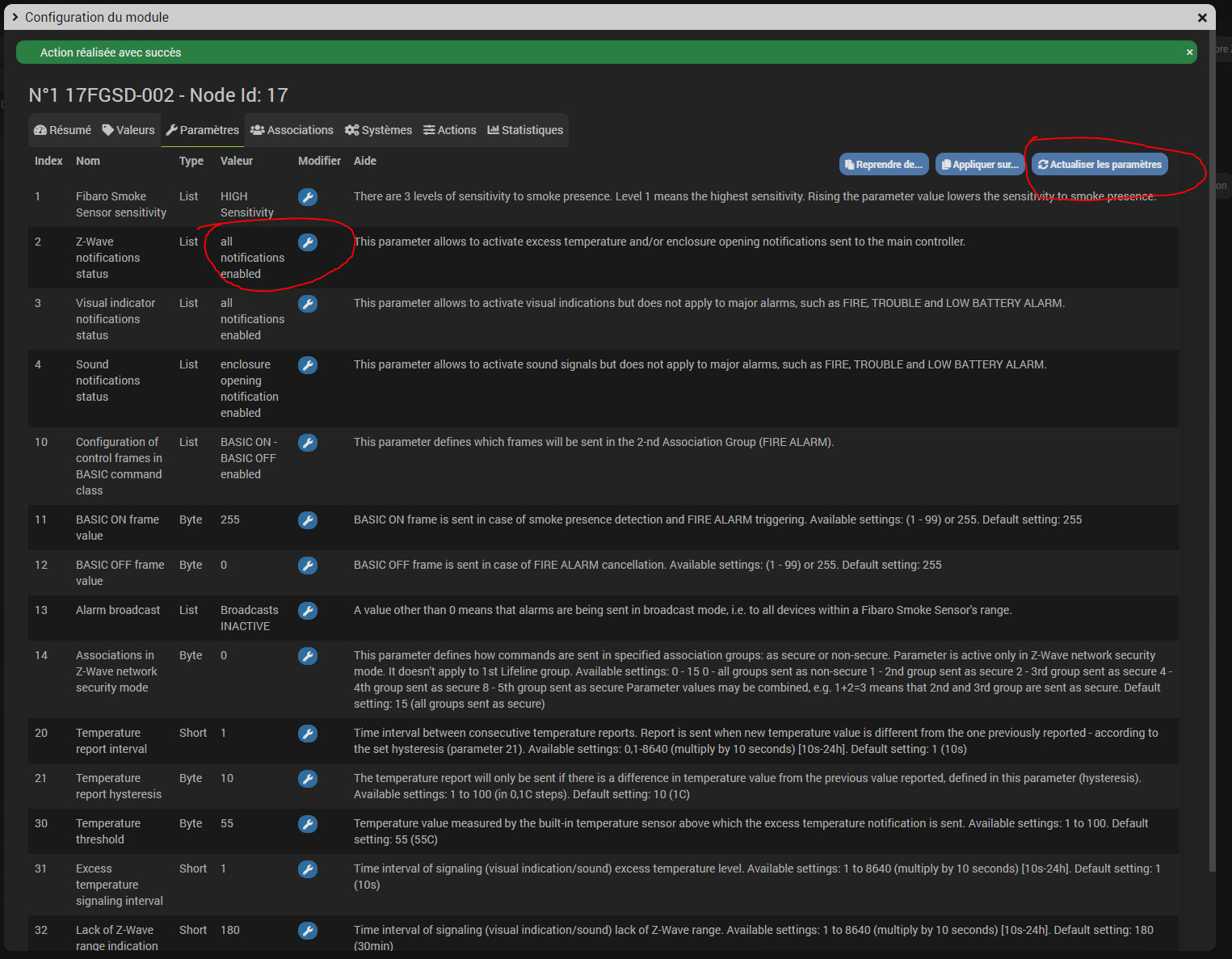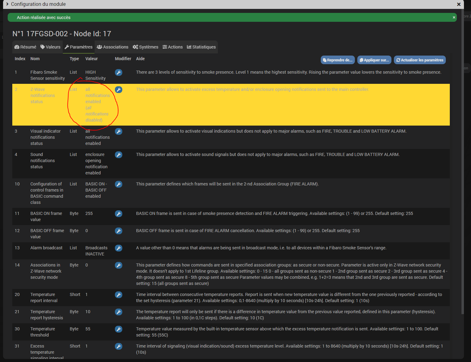 2 - modifier le paramètre « 21 - Temperature report hysteresis »: je l’ai mis à « 2 » pour avoir une notification chaque fois que la température change de 0,1 degrès