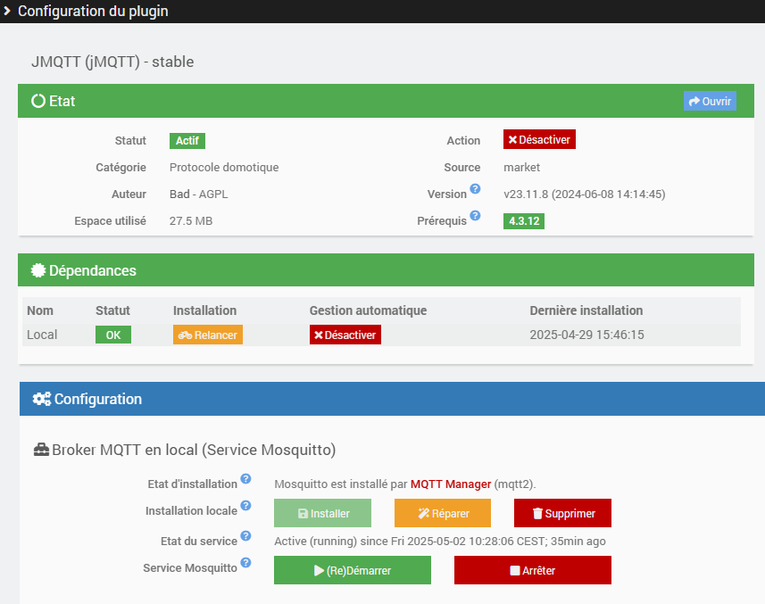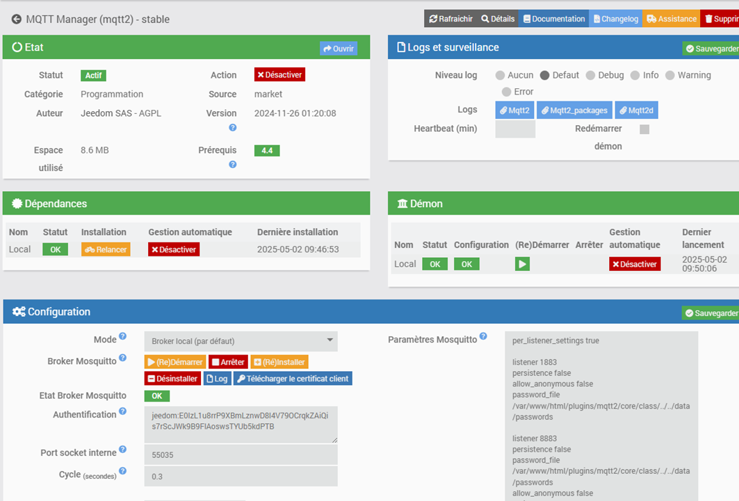 Pour jmqtt vous faites comme bon vous semble mais il faut le configurer pour utiliser le mosquitto de mqttmanager. Il ne doit pas installer mosquitto. Par contre vous avez un souci avec zwavjs qui se base sur mqtt2 donc je ne comprends pas.pour quoi vous donnez des infos jmqtt.